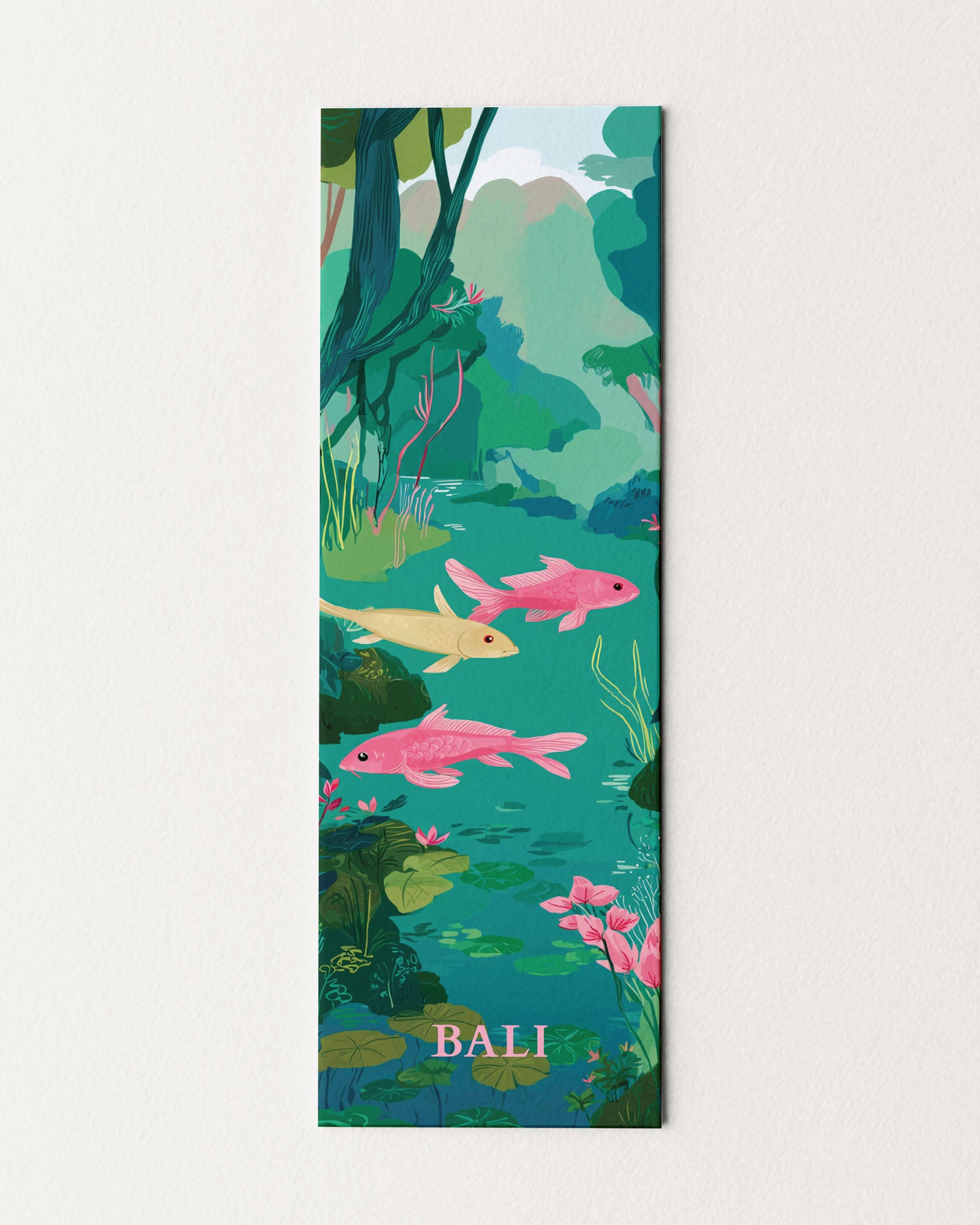 This bookmark adds a sense of calm and gentle movement to your reading routine. The illustration shows koi fish gliding through a lush tropical pond surrounded by deep green foliage, soft pink flowers, and tranquil water inspired by Bali. The illustration style feels serene and flowing, with rich greens and warm coral tones. It works beautifully as a Bali souvenir and a small Bali gift for book lovers and design lovers alike.