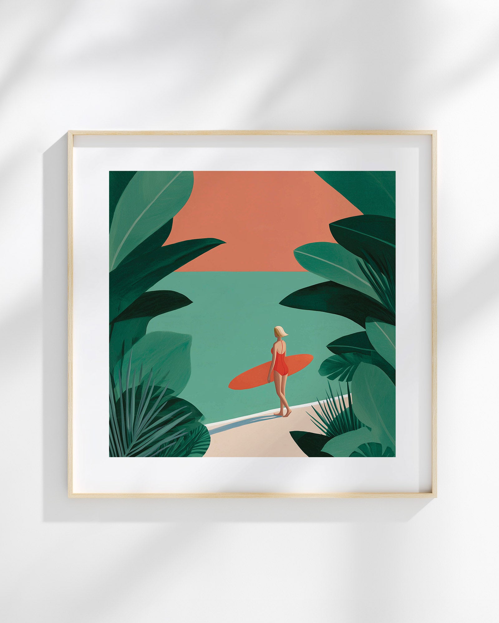 This art print brings a clean, modern calm into a space. The illustration shows a surfer standing by the water, framed by large tropical leaves and a quiet horizon. Soft color blocks in green, coral, and sandy tones with a minimal illustrated style create a balanced and contemporary feel. It works as a thoughtful Bali souvenir for those who appreciate Bali through surf culture and simple design.