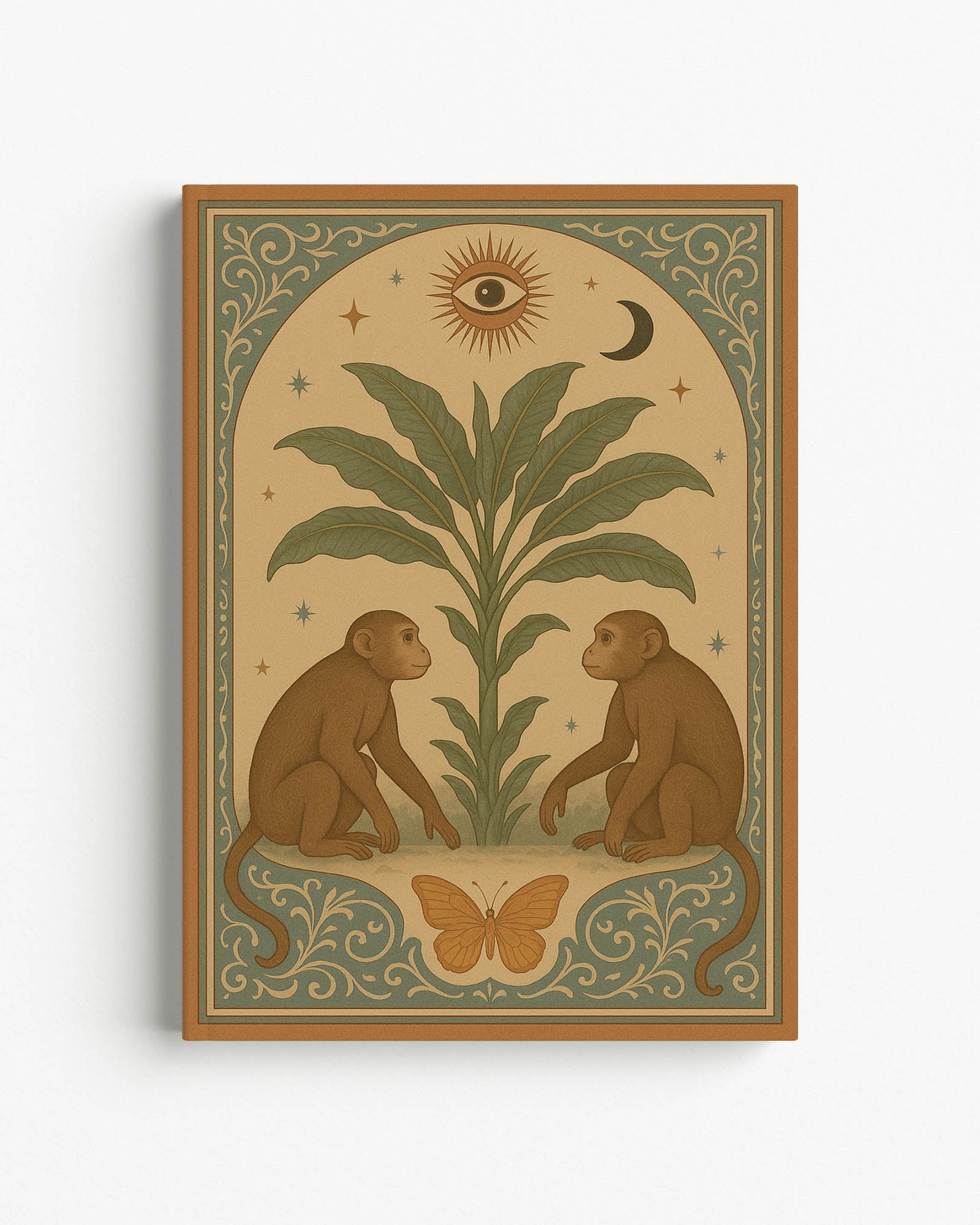 Step into a world of quiet symbolism and ancient stories. This notebook features two mirrored monkeys beneath a sacred plant, framed by celestial motifs that evoke balance, intuition, and inner wisdom. Warm earthy tones and ornate details give the cover a timeless, talisman-like feel. A unique Bali souvenir and a meaningful gift for those drawn to mystical imagery, slow writing, and thoughtful moments.