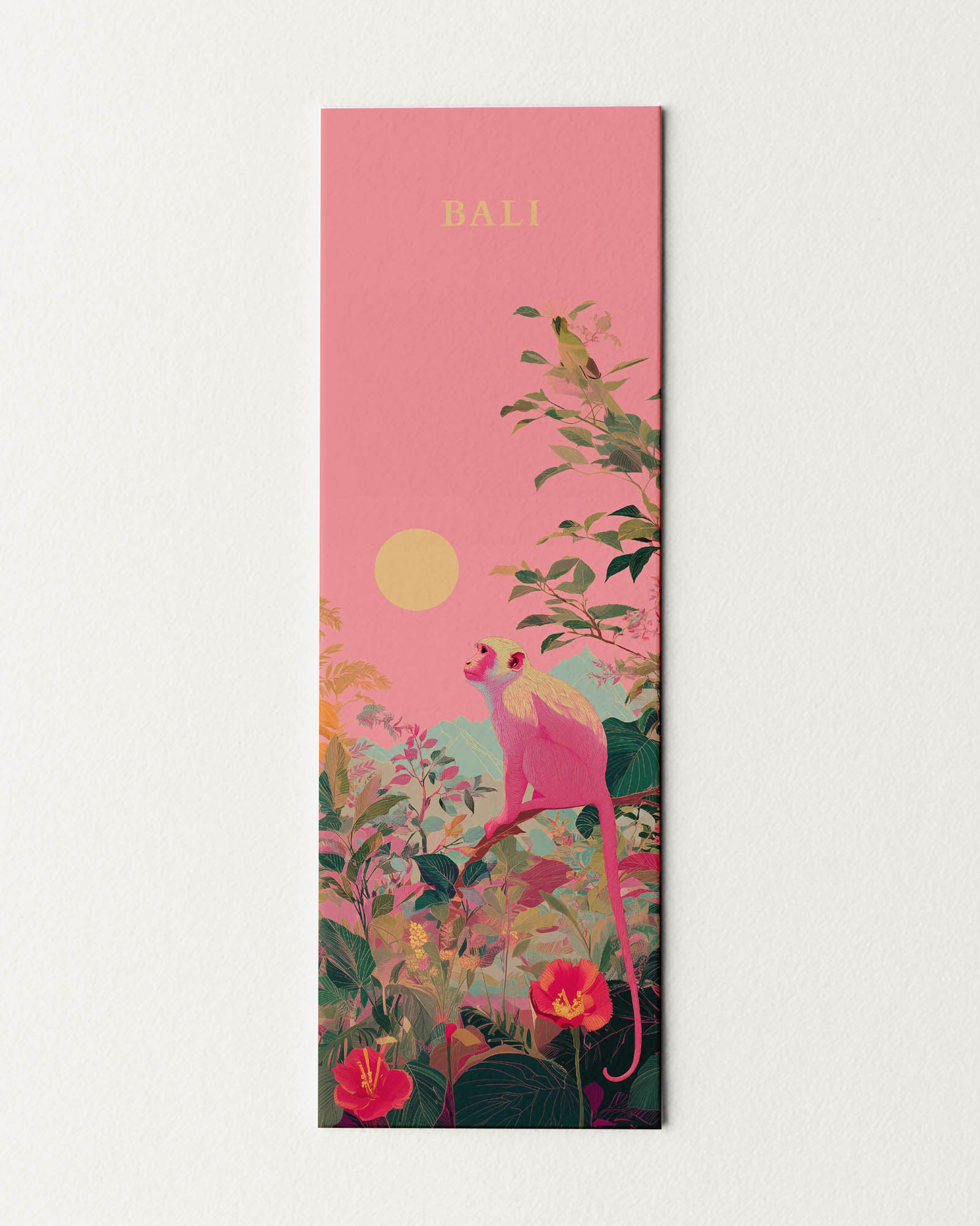This bookmark brings a playful pause to your reading moments. The illustration features a pink-toned monkey perched among lush tropical leaves, flowers, and distant mountains under a soft sunset sky. The style is bold yet balanced, mixing vibrant colors with a calm, illustrated finish. It works beautifully as a Bali souvenir and a cheerful Bali gift inspired by Bali’s lively nature.