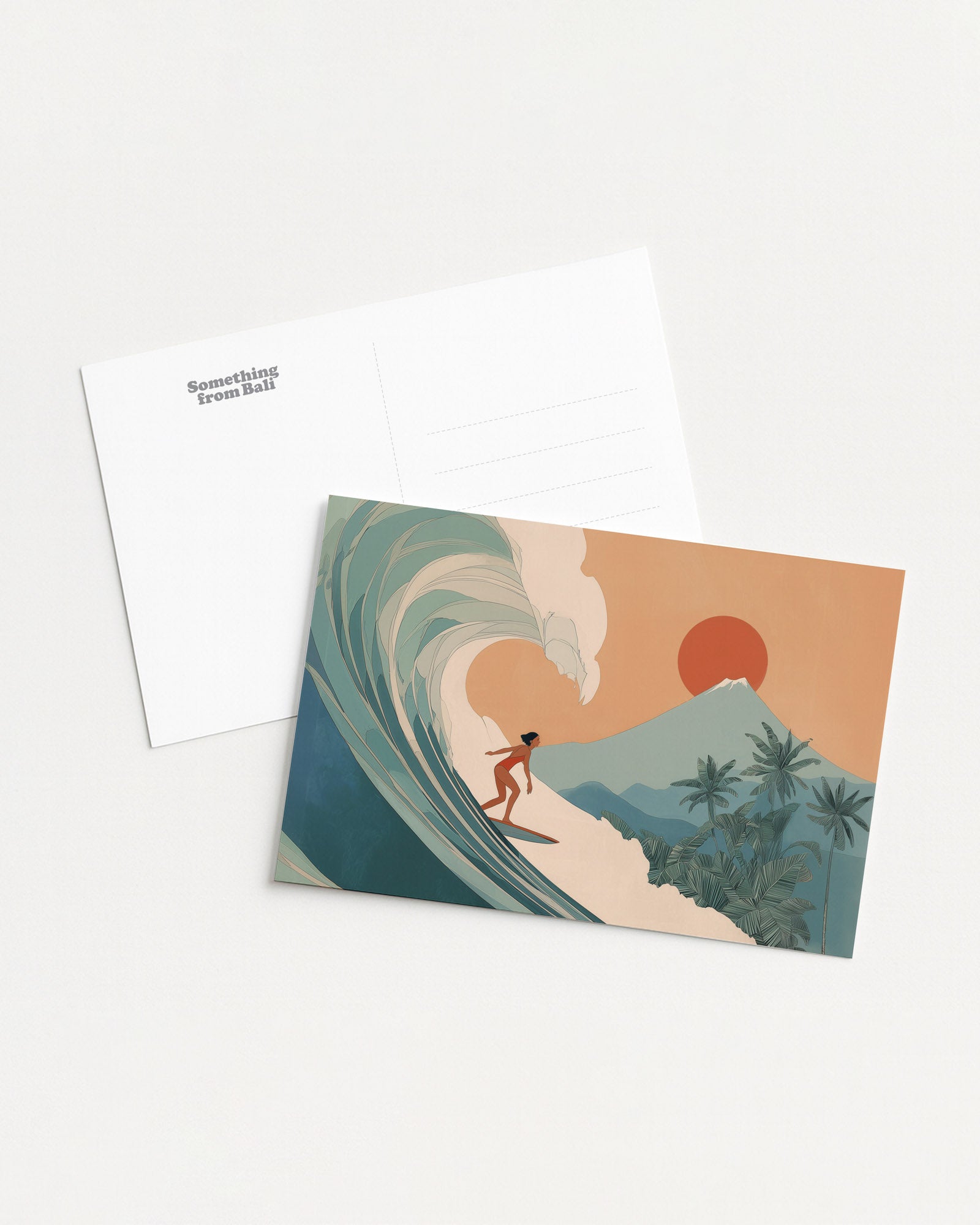 Bring a sense of freedom and flow into everyday moments. This illustrated postcard shows a surfer riding a curling wave with palm trees and a distant mountain under a warm sun, inspired by Bali. Clean lines and a soft palette of ocean blues, sandy tones, and muted coral create a calm yet dynamic mood. A modern Bali souvenir that works well as a Bali postcard or an easy Bali gift.