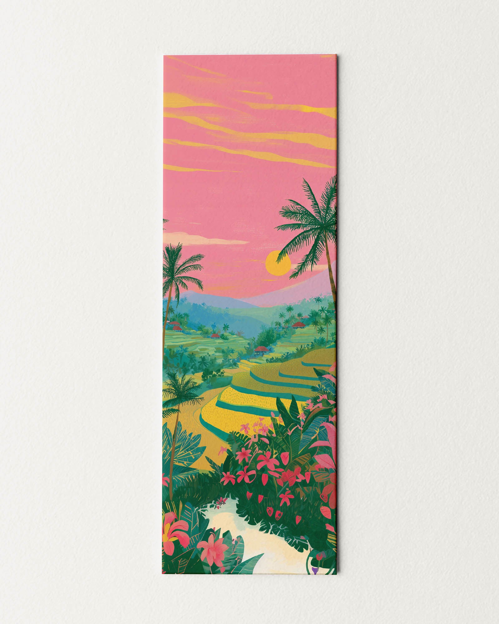 Bring a soft sense of morning calm to your reading moments. This illustrated bookmark shows layered rice terraces, palm trees, and tropical flowers under a pink sky with the sun rising over distant hills. The gentle gradients and balanced composition create a warm, peaceful mood. A serene Bali souvenir to keep, gift, or place inside a favorite book.